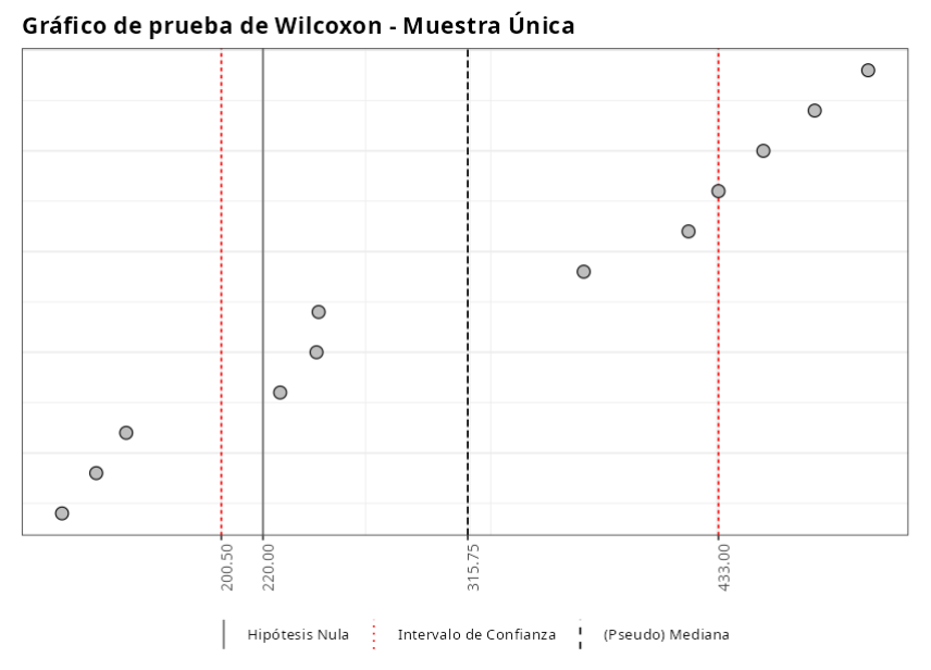 El estadístico de prueba es V = 63. Como el P-valor es igual a 0.0639 = 6.39% > 5% no rechazamos la hipótesis nula de que $\theta_0$ = 220 en el nivel de 5% de significancia.