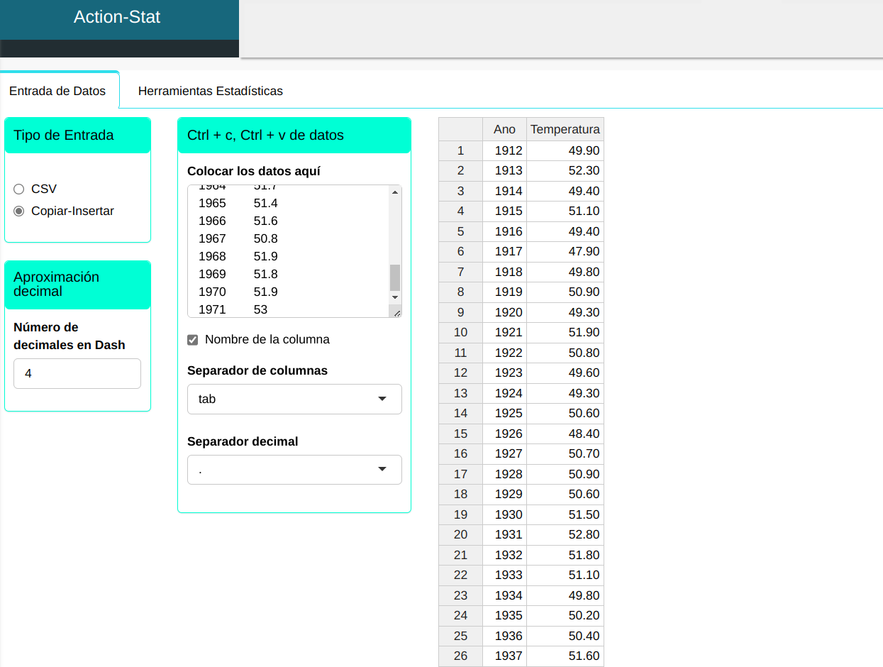 Consideremos los datos sobre las temperaturas medias anuales en la ciudad de Nueva York para los años 1912 y 1971. Vamos a ajustar un modelo simple de media móvil a esta serie temporal y predecir la temperatura en los próximos 5 años.