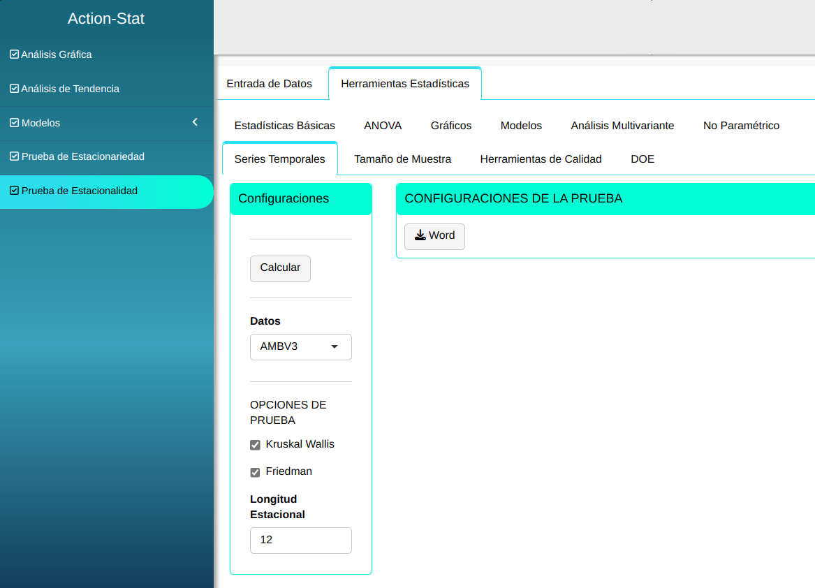 Algunas series de tiempo exhiben un comportamiento conocido como estacionalidad. La estacionalidad de una serie temporal es el número de observaciones que toma la serie para repetir el patrón. En la herramienta “Pruebas de Estacionalidad”, es posible realizar dos pruebas para comprobar si la serie presenta estacionalidad.