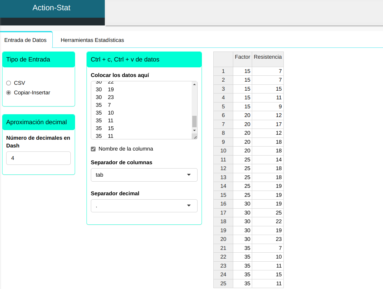 Consideremos el proceso de producción de una fibra sintética, en el que el experimentador desea conocer la influencia del porcentaje de algodón en la resistencia de la fibra. Para ello, se realiza un experimento completamente aleatorio en el que se evalúan diferentes niveles de porcentaje de algodón en relación con la resistencia de la fibra. Un punto importante en el montaje del experimento es que, para cada nivel de factor (porcentaje de algodón), los demás factores que influyen en el proceso deben mostrar un patrón homogéneo de variabilidad. En el experimento tomamos 5 niveles para el porcentaje de algodón y 5 repeticiones. Los valores están en cuadro a continuación: