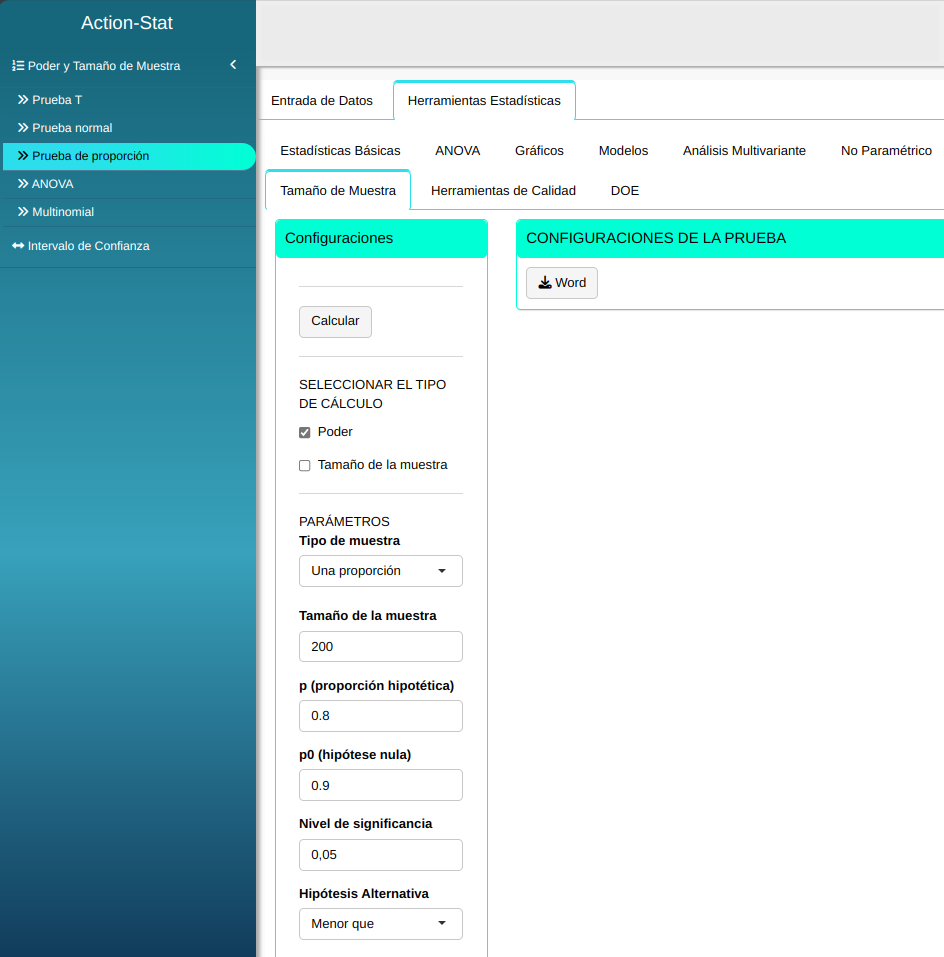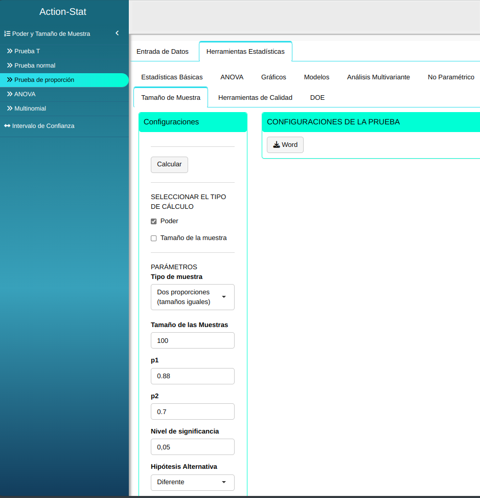 Aquí se utiliza la prueba de una proporción para calcular el poder del test o el tamaño de la muestra.